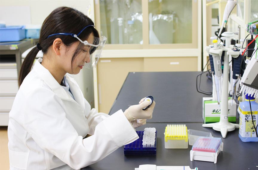 私は現在、免疫疾患領域における薬効薬理試験を行っています。主にin vivo試験に取り組んでいますが、試験内容によってはin vitroの実験も行います。薬の候補体が疾患を治療することができるのか、正しく評価できるように日々試行錯誤しながら業務を進めています。また、正しい評価をするためには安定した手技が必要ですので、技術向上のために知識の吸収と手技の練習にも励んでいます。学生時代はアルツハイマー病の治療薬についてin vivoで薬効評価していました。疾患の領域は異なりますが、疾患モデル間の差やヒトとの違いについての考えかたなどは今の業務にも生かされています。