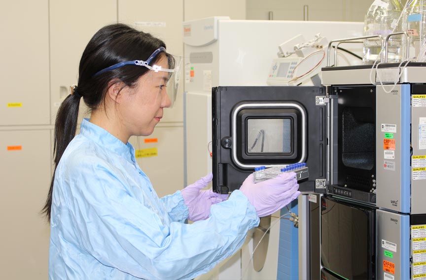 臨床試験における薬の安全性や有効性・体内動態等の評価のために、生体試料(血液・尿など)に含まれる薬やバイオマーカーを測定しています。測定対象の薬やマーカーひとつひとつに合わせた測定法を開発し、バリデーション試験にて測定法の妥当性(精度良く正確に測定できるかなど)を確認した後、実際の臨床試料を測定します。得られたデータは中外製薬にて解析および評価され、薬の開発方針の決定や承認申請に使用されます。業務には実験業務の他に計画書や報告書などの文書作成業務や、SOP(標準作業手順書)整備やQC(品質点検)作業などの信頼性保証業務もあり、グループメンバーと分担して行っています。