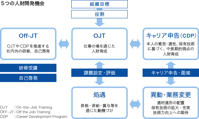 人財育成は、日々の業務を通じた育成(OJT)が中心です。さらに、本人の意思・適性に基づいた中長期的な視点で行うキャリア申告(CDP)や、社内外の研修(Off-JT)も重要な機会となります。