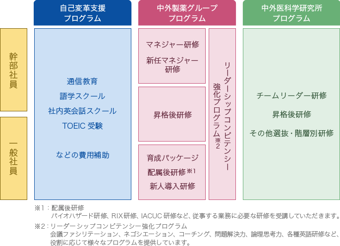 当社の研修は、主に3つのカテゴリーから構成されています。特に入社後は新入社員研修および配属後研修など、スムーズに業務に従事できるよう、様々な人財育成の機会を提供しています。また、通信教育や英会話スクールなどの自己啓発をバックアップするとともに、当社独自の研修に加え、中外製薬が実施する研修へも参加できるため、とても充実した内容となっています。